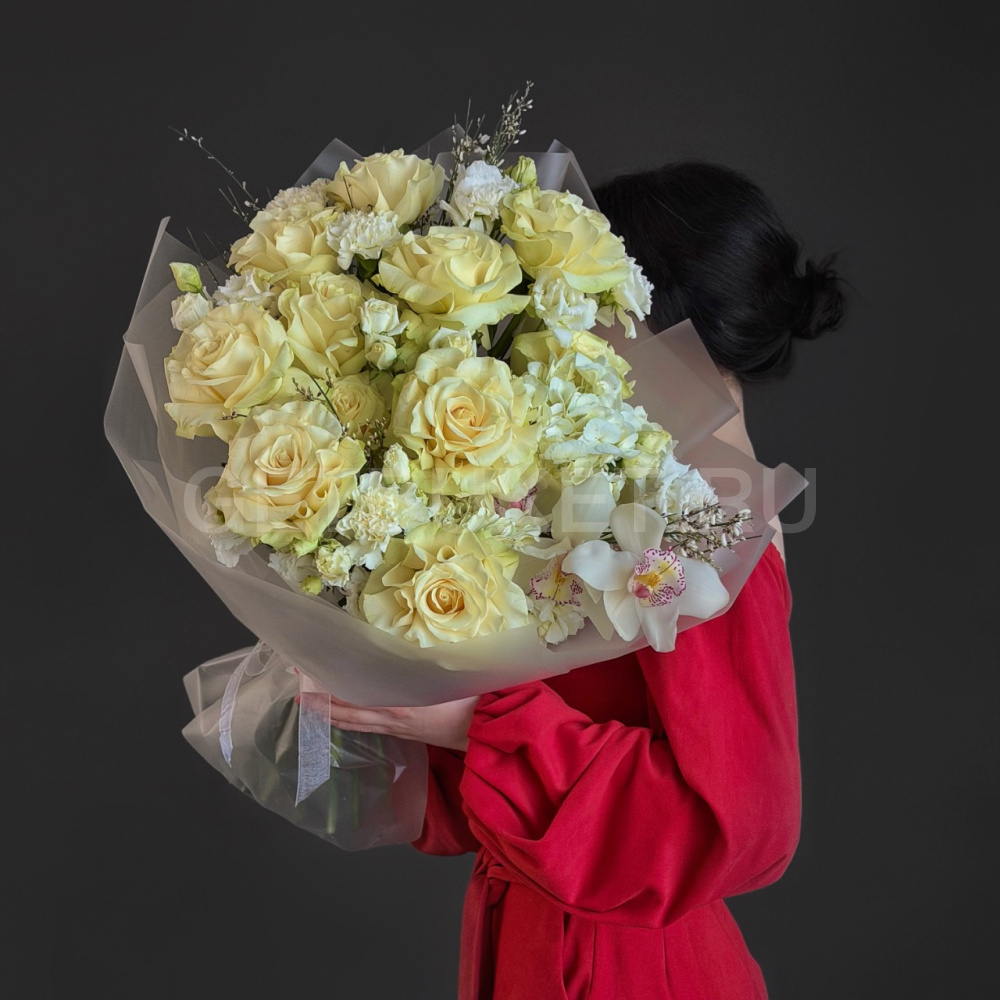 Нежный букет с белой гортензией, розами и орхидеей с генистой
