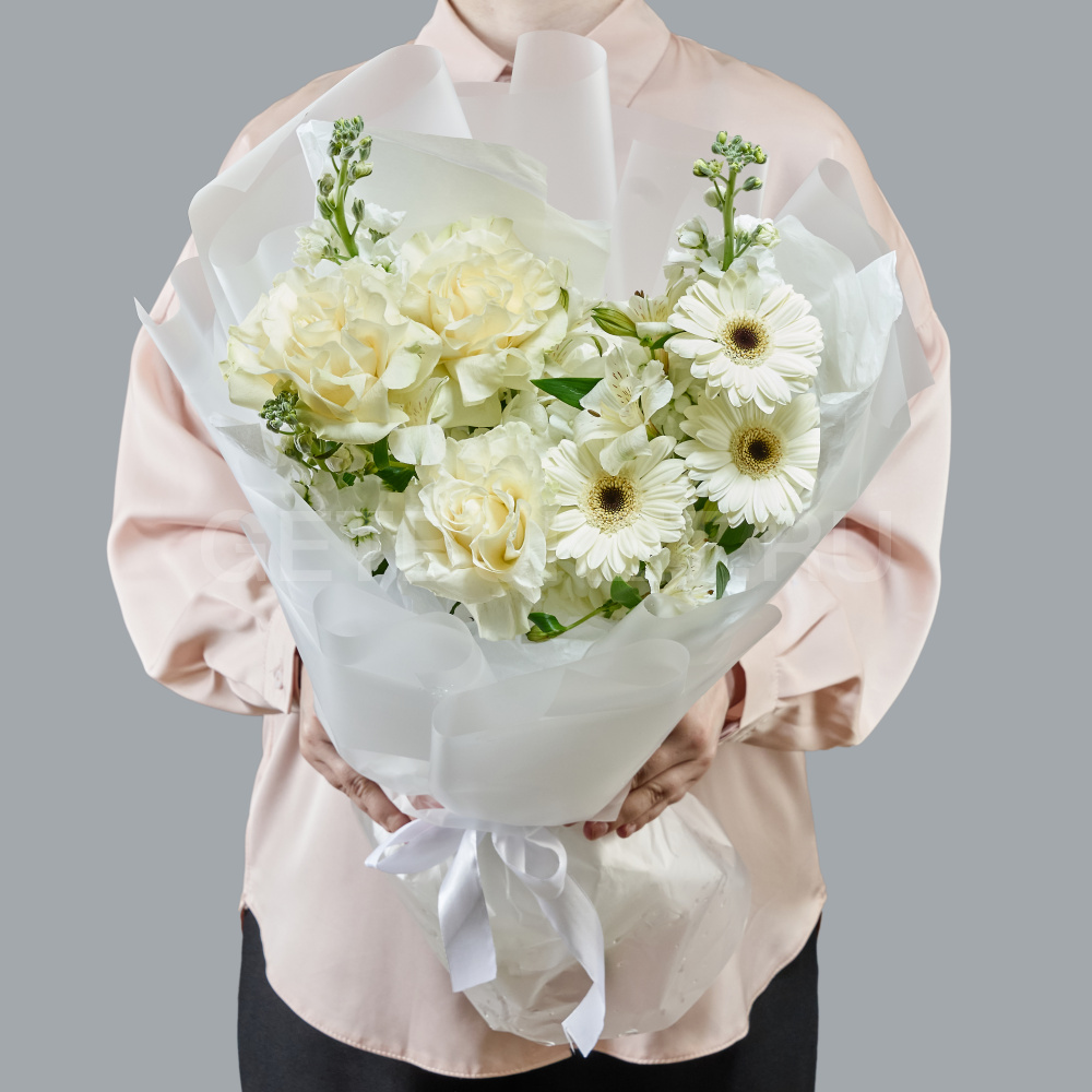 Букет из белых эустом, гербер и гвоздик с розами9 000 ₽Букет из белых эустом, гербер и гвоздик с розами 9 000 ₽ -