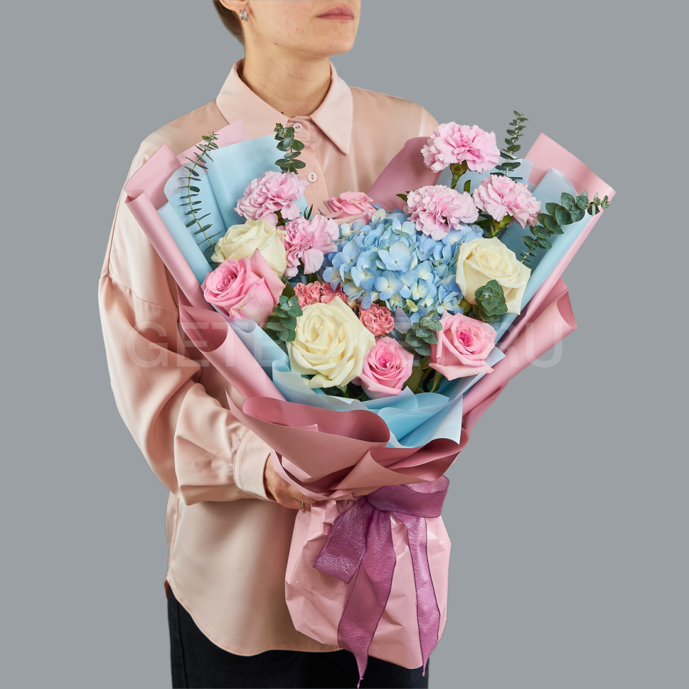 Букет из голубой гортензии, розовых гвоздик и роз с эвкалиптом