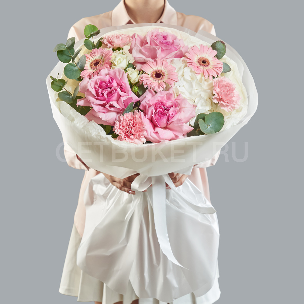 Букет из роз, гвоздик и розовой гортензии с эустомой18 770 ₽Букет из роз, гвоздик и розовой гортензии с эустомой 18 770 ₽ -