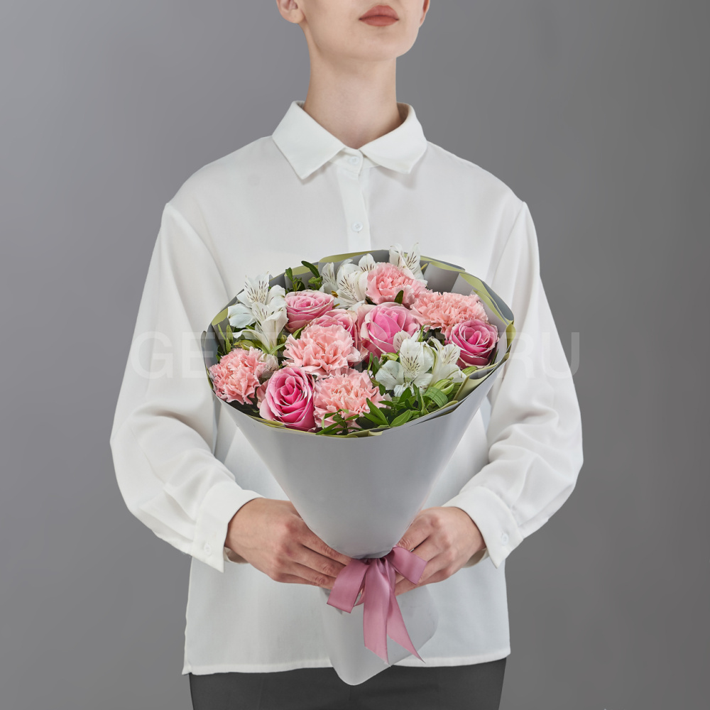 Букет из розовых гвоздик, роз и альстромерий3 660 ₽Букет из розовых гвоздик, роз и альстромерий 3 660 ₽ -