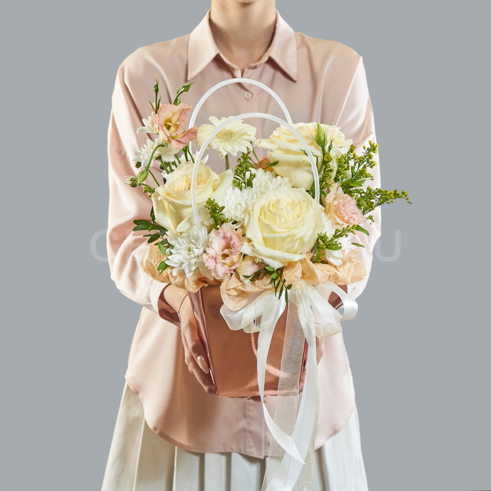 Цветочная композиция с розами, хризантемой и танацетумом в сумочке4 030 ₽Цветочная композиция с розами, хризантемой и танацетумом в сумочке 4 030 ₽ -