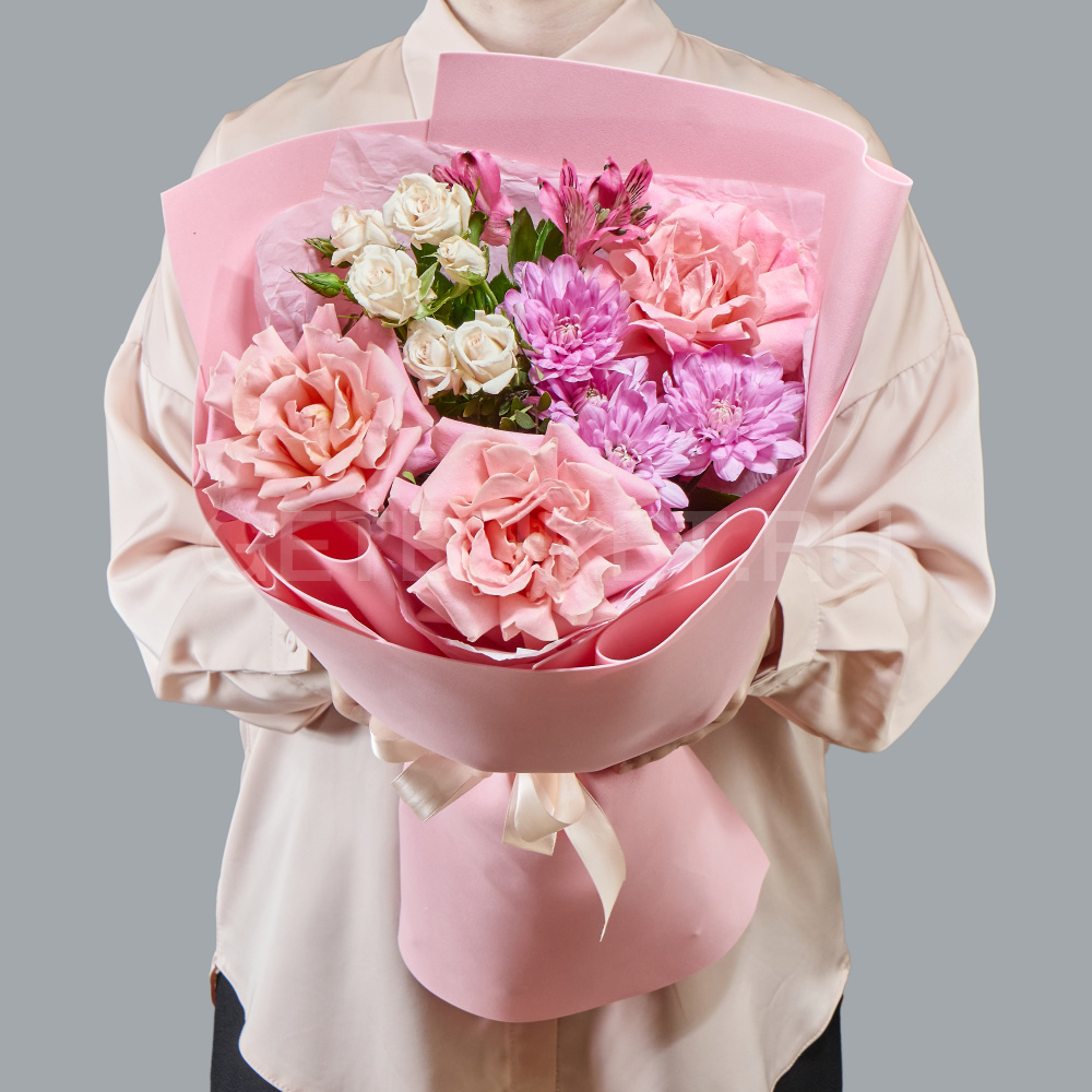 Букет роз с хризантемами и альстромерией