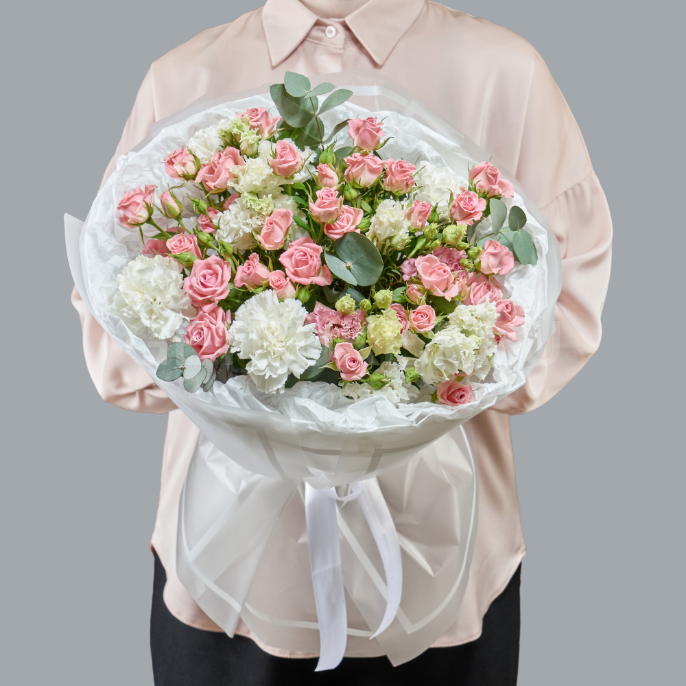 Букет кустовых роз с гвоздикой и эустомой