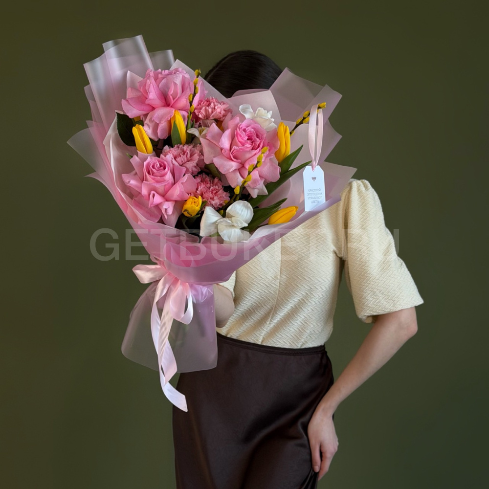 Букет из роз, тюльпанов и гвоздик с вербой