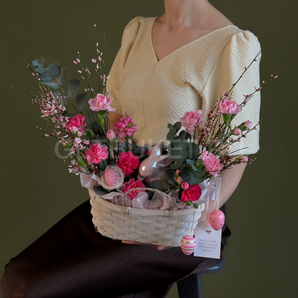 Цветочная композиция с гвоздиками, нарциссами и вербой в плетеной корзине5 270 ₽Цветочная композиция с гвоздиками, нарциссами и вербой в плетеной корзине 5 270 ₽ -