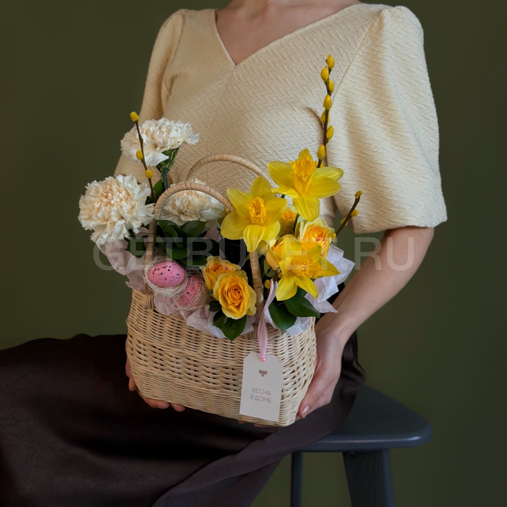 Цветочная композиция с гвоздиками, нарциссами и вербой в плетеной корзине5 270 ₽Цветочная композиция с гвоздиками, нарциссами и вербой в плетеной корзине 5 270 ₽ -