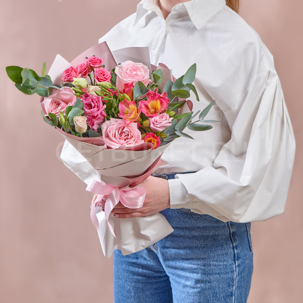 Букет из розовых роз с гвоздиками и эустомой8 190 ₽Букет из розовых роз с гвоздиками и эустомой 8 190 ₽