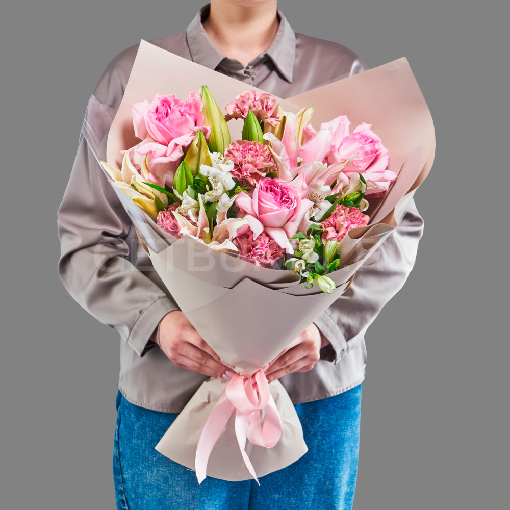 Нежный букет из розовых роз, белых гвоздик и альстромерии5 240 ₽Нежный букет из розовых роз, белых гвоздик и альстромерии 5 240 ₽ -