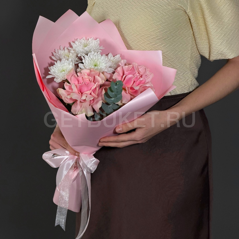 Букет розовых роз с гвоздиками4 190 ₽Букет розовых роз с гвоздиками 4 190 ₽ -