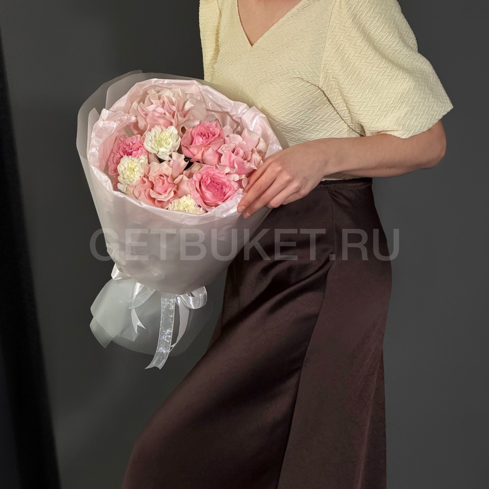 Букет розовых роз с гвоздиками4 190 ₽Букет розовых роз с гвоздиками 4 190 ₽ -