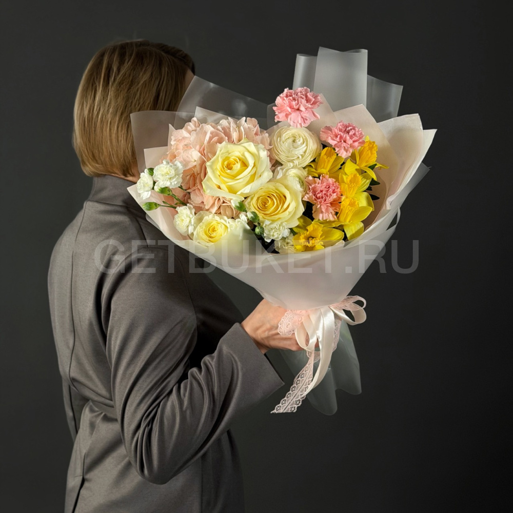 Букет из ранункулюсов с гортензией, розами и нарциссом